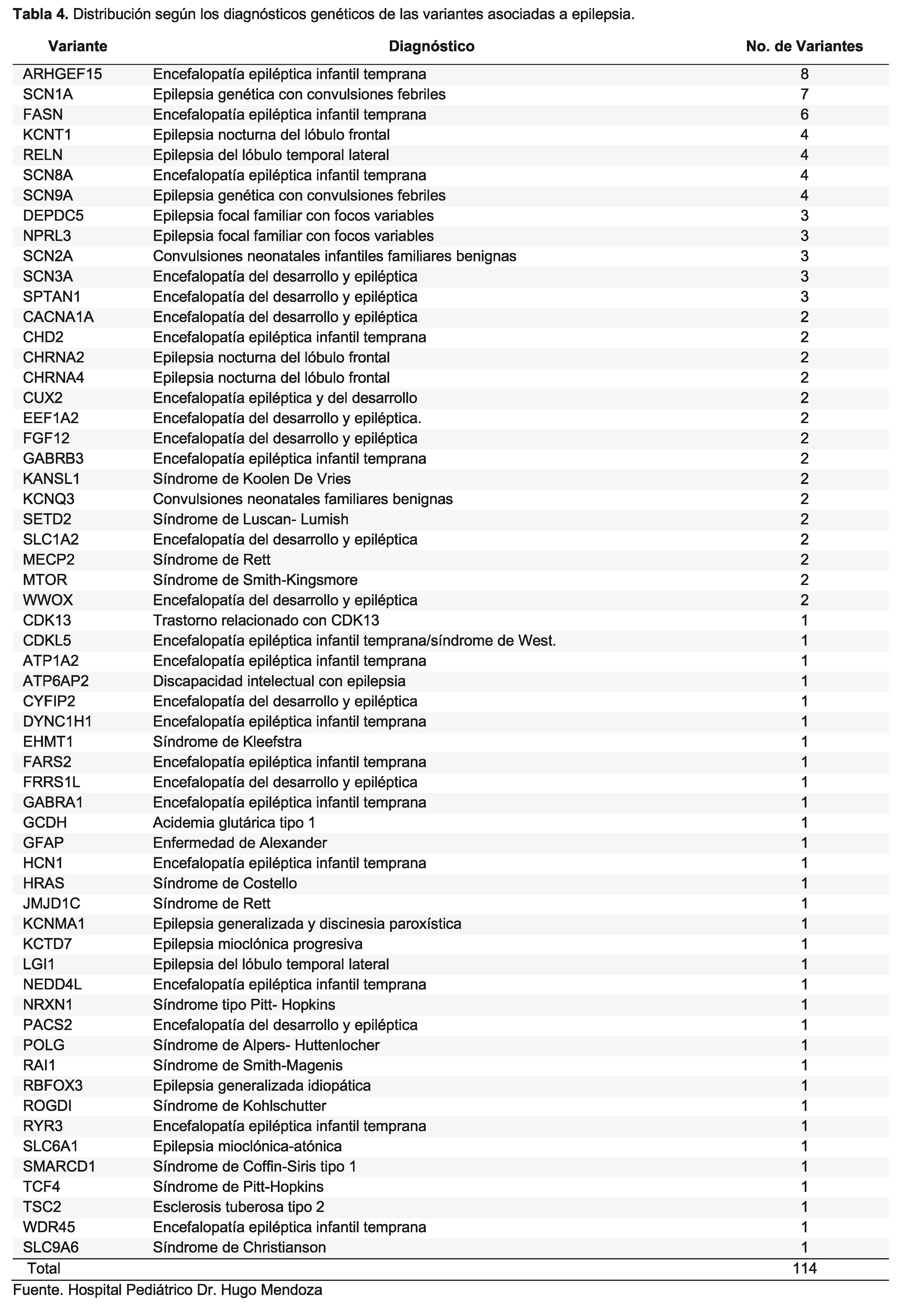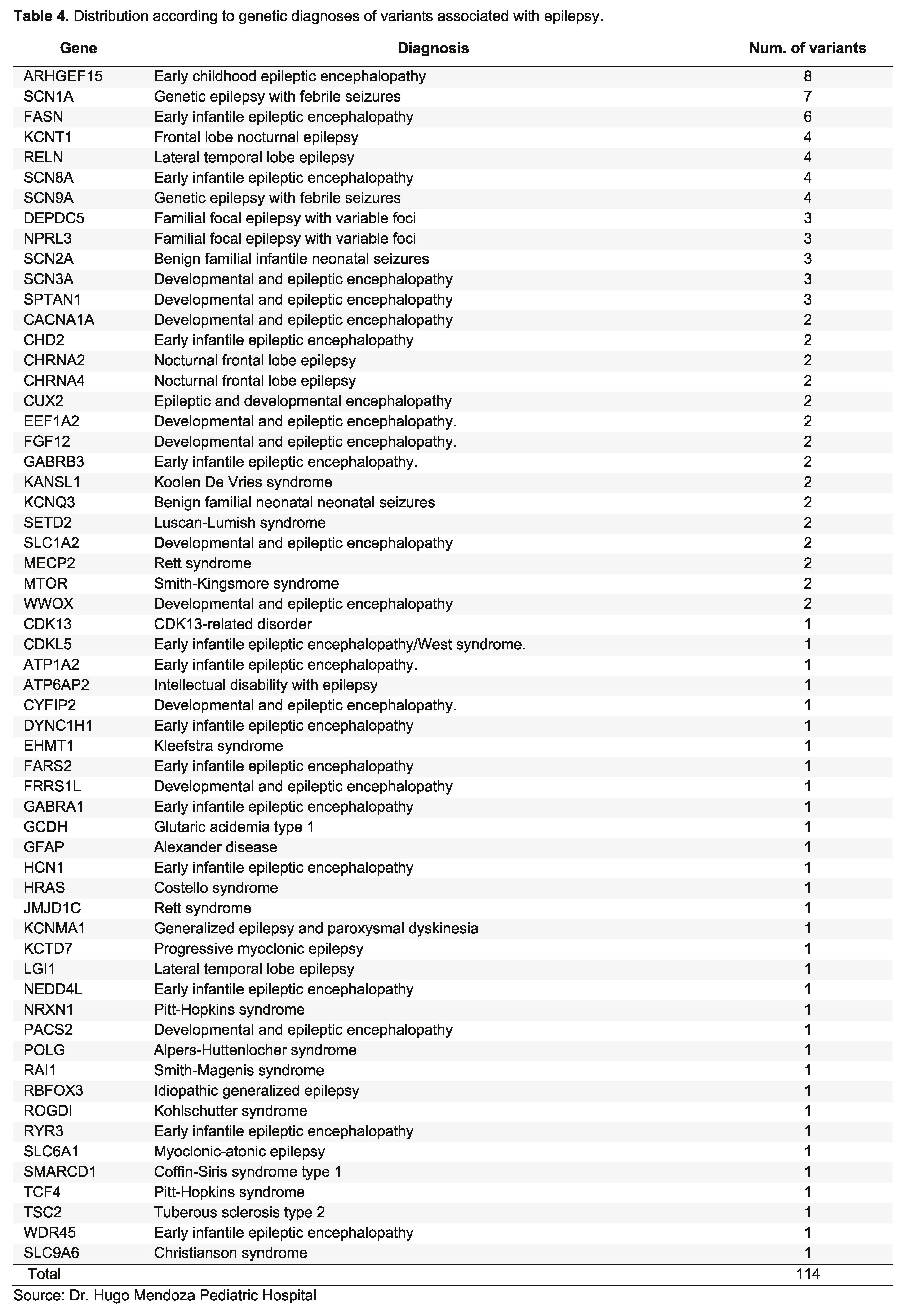 This is a condition that is difficult to treat, given the high rate of drug resistance that we currently have, so it is essential that the latest molecular genetic diagnostic technologies, such as Next Generation Sequencing (NGS), are introduced into routine clinical practice. These technologies help us to differentiate the cause of epilepsy, from a disorder of genetic origin, to a syndrome of organic origin, caused by trauma, tumors, cerebrovascular events, etc. In this study, we evaluate the most frequent genetic variants associated with epilepsies in patients of the Pediatric Hospital from August 2018 to August 2021.