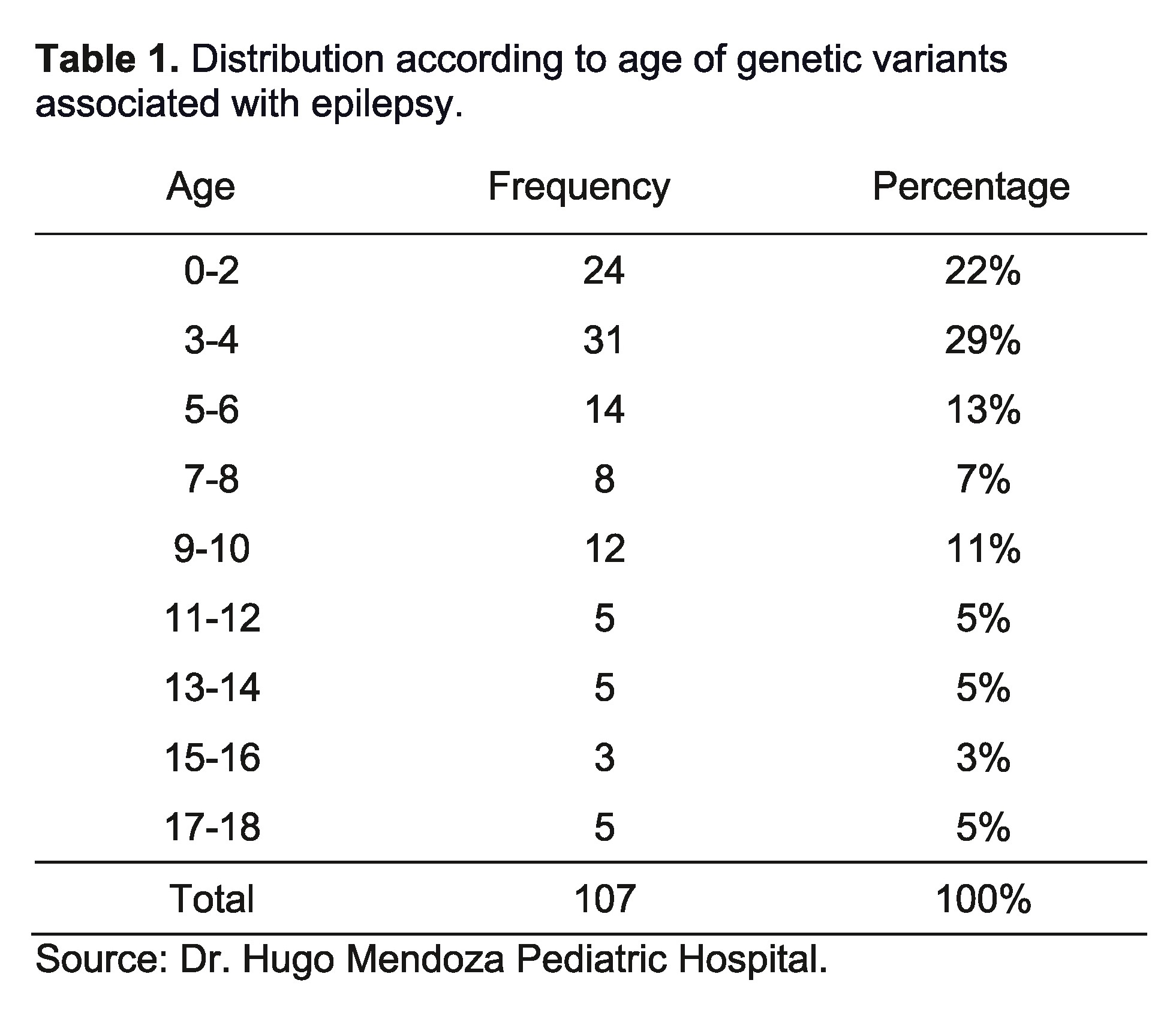 The general objective of this work is to determine the frequency of genetic variants associated with epilepsy in our population. Specifically, we wish to identify the most frequent age and sex of the genetic variants associated with epilepsy (See Supplementary Table 2). The inheritance pattern of the genetic variants associated with epilepsy is also determined. Likewise, the molecular diagnosis and the zygosity of the genetic variants found are established.