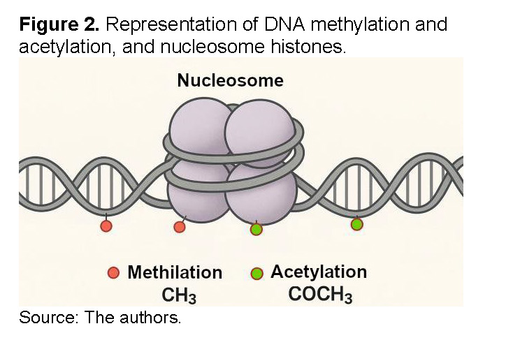 The main epigenetic mechanisms work through chromatin modification [19]. DNA methylation, which involves adding methyl groups to cytosine bases, usually silences genes by preventing transcription (See Figure 2) [20]. Similarly, histone modifications, such as acetylation and methylation, alter chromatin compaction. Acetylation, for example, tends to relax the structure and facilitate transcription, while methylation can have activating or repressive effects, depending on the specific histone modified [21].